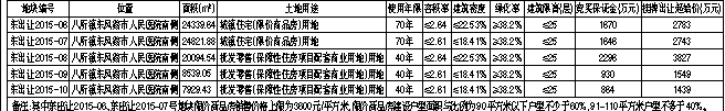 备注:其中东出让2015-06、东出让2015-07号地块限价商品房销售价格上限为3600元/平方米,限价商品房建设户型面积与比例为90平方米以下户型不少于60%,91-110平方米户型不多于40%。