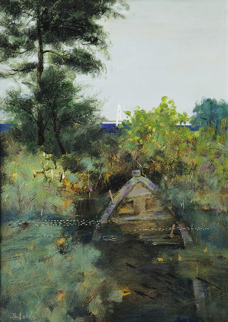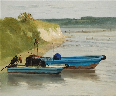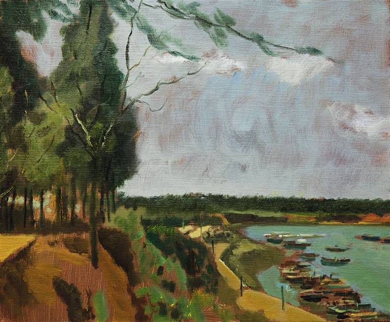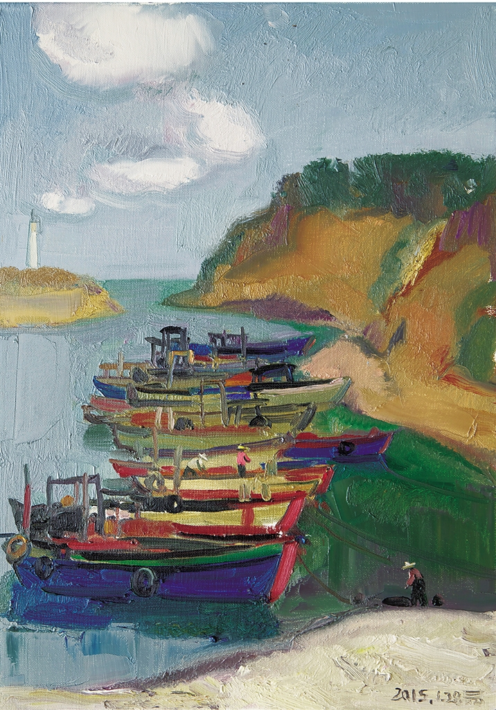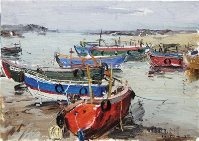 这幅获李生琦称赞的油画,是陈宜明以澄迈县桥头镇玉包港写生创作的。画面里没有一个渔民,只有十余艘休渔中的渔船静静地停靠在滩涂地上,普遍被漆出深深浅浅的红、黄、绿三色的船身在阴沉的天空和土地之间,却也不显得过分艳丽而是张弛有度、收放自如,彰显了画家纯熟的绘画及用色技巧。