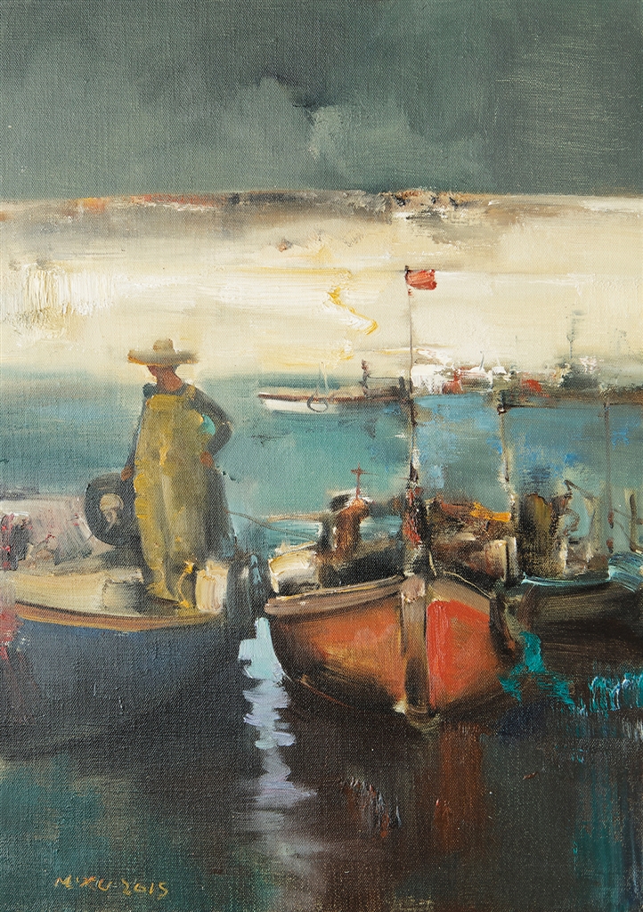 “你看,这幅画传递出来的情绪十分平稳,呈现的是一个艺术的世界而非物理的世界。”站在中国美院教授、硕士生导师陈宜明的作品《停靠在港湾里的渔船》前,海南师范大学教授、硕士生导师李生琦正借着参展的机会给学生讲课,“可以看出,画家在创作的过程中非常讲究画面和用色,所以最终作品就像一杯茶一样,和谐而舒适。”