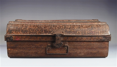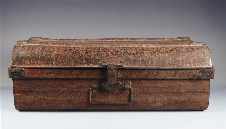 在海南省万宁市兴隆华侨农场的展览馆里有这样一只箱子,铁皮制,通长71cm,通宽38cm,通高25cm,箱盖上有两条凸出的方棱,箱盖与箱体连接处有凸出的边沿,可见三角形图案纹饰。箱体外无漆,有波浪形条纹,呈自然铁锈色,箱体内涂有一层细腻的红色漆面。此箱品相完好,做工精湛,是兴隆华侨农场职工、马来西亚归侨陈春成捐赠的。