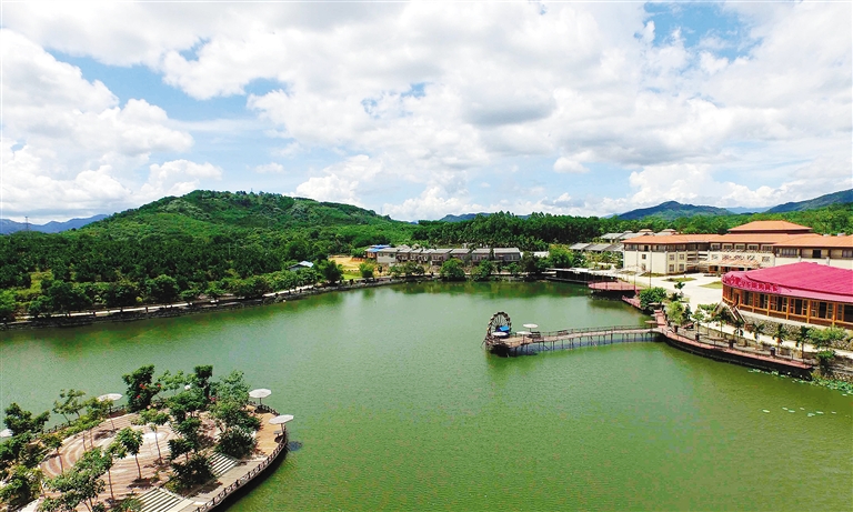 在琼中黎族苗族自治县营城红云湖农家乐,蓝天白云、青山绿水和风车木桥,使人仿佛置身世外桃源。