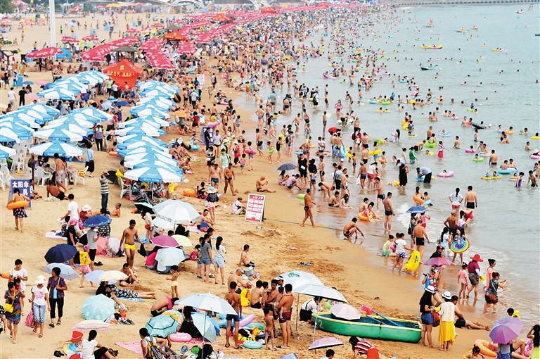 7月13日,山东青岛第一海水浴场游人众多。 当日是三伏第一天,高温下的青岛海滨浴场开启“下饺子”模式,人气“爆棚”。 新华社发(王海滨 摄)