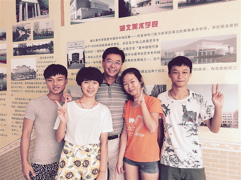 寒来暑往,学校美术老师从两个增加到9个,2014年首届两个美术班63名学生,全部考过了二本线。他们中,中考分数最高是57分,最低的是18分,全都如愿上了大学,学习美术类相关专业。“韩丹同学中考时只有18分,高考时以405分被湖南工业大学科技学院环境设计专业在提前批录取。”靖校长自豪地说。