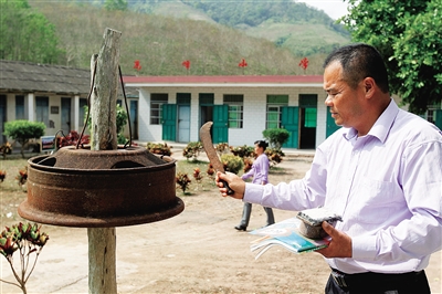 下坡后前行约三公里,记者此行的目的地——高峰小学终于到了。今年53岁的符程庄,是高峰小学的校长。从1988年到高峰小学当代课教师至今,符程庄已在这所大山深处的学校整整工作了27年。