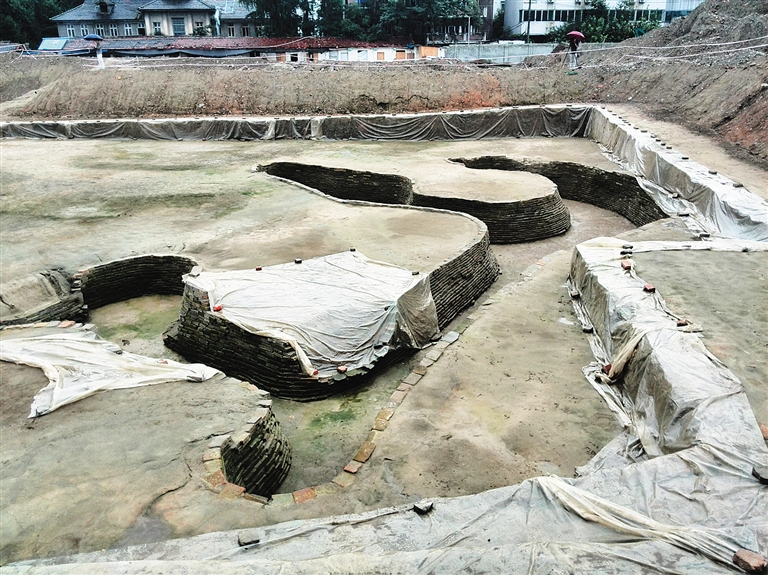 成都通锦路古园林遗址局部(手机拍摄于7月13日)。 经过近4个月的作业,成都市考古队近日完成了对成都通锦路古遗址的考古发掘,共发掘约2500平方米的遗址,其中最重要的是全长90米的唐代砖砌沟渠和一处人工池塘。考古专家初步判定,遗址主体可能是建造于盛唐时期的人造景观建筑群,由于距古万佛寺遗址较近,很可能为寺院园林,这对于研究隋唐五代时期成都地区的园林建筑和城市发展史都具有重要的学术价值。