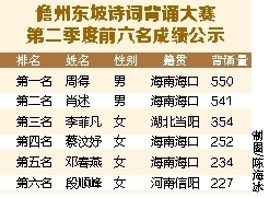 儋州文旅公司有关负责人说,东坡诗词背诵大赛特点鲜明:一是成绩大幅攀升。比如第二季度第一名成绩比第一季度第一名多324首,第二季度第六名比第一季度第一名还多1首。二是选手年龄跨度大。比如第一季度选手年龄最大者82岁,第二季度选手年龄最小者5岁。三是参赛者地域覆盖面广,来自广东、贵州、四川、湖南、上海、新疆、河北、河南、陕西、甘肃、吉林、黑龙江、海南等多个省市自治区。