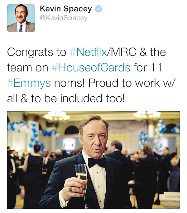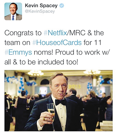 《纸牌屋》的表现相当不错,得到11项提名。主演凯文·史派西即发推恭喜该剧的制作团队。史派西也凭借此剧第三次进军视帝。