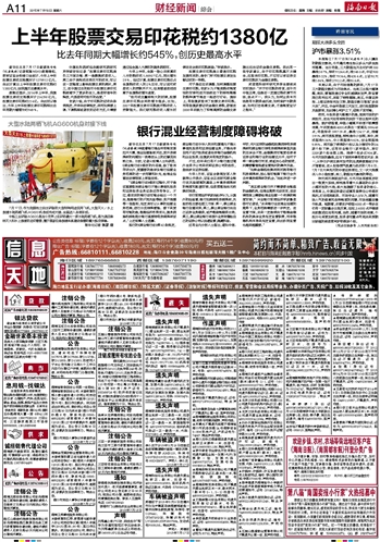 上半年股票交易印花税约1380亿