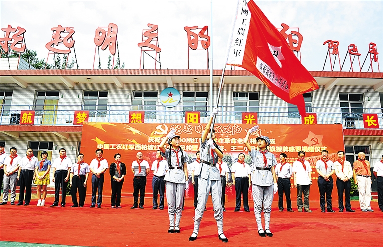 7月18日,中国工农红军西柏坡红军小学的学生代表在授旗仪式现场挥舞校旗。 当日,中国工农红军西柏坡红军小学总校及其分校授旗授牌感恩捐赠仪式在河北省平山县西柏坡举行。仪式上,社会各界人士向学校捐赠电教设备、文化用品等用来改善红军小学的教学条件。据悉,西柏坡红军小学是由全国红军小学建设工程理事会援建的第200所红军小学。 新华社记者 鲁鹏 摄