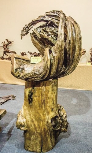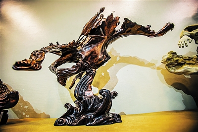 海南省根雕文化艺术协会副会长王劲民的《放飞梦想之歌》阴沉木作品,也表现出海南根雕艺术的独特魅力,体现了科学的真、人文的善、艺术的美。