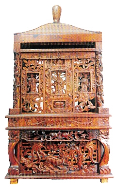 这一时期,海南岛的文化开发同经济开发缓慢相联系。木雕装饰主要分布于文庙、祠堂和较为富有的民居。文庙、宗祠规模不大,结构较为简单,檐架、斗拱点缀着一些木雕作品,民居建筑基本不作雕饰。虽然岛上人家并不殷实,但是民风民俗淳厚,特别敬奉祖先。因此营造祠宇,以纪念、供奉祖宗,为世所重。以求神灵庇佑,祈求平安,降福于子孙。基于此,民间神舆、神龛,供奉祖先牌位的神床,香案(又称神案)特别注重木雕装饰。文昌、琼海、定安、琼山一带的民居神床用一块块相对称的透雕、高浮雕花板与透雕插接装饰件组装成“∏”字形的帷幕。神床木雕成为海南木雕艺术的集大成者。可叹“文革”浩劫、飓风自然灾害和人为的毁弃,原本设有神床的民居现在已是十室九空。今天的木雕藏家收藏到的木雕作品,基本上是过去神床香案上的木雕组装件。海南家俱雕刻主要见于椅背上,其它家俱很少作雕饰。