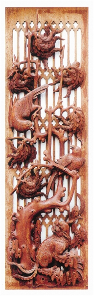 坐落在海口市旧州镇包道村的侯家大院“宣德第”,建于清光绪年间,具有典型的海南民居建筑特点。宅内建筑的斗拱、梁架及门窗,祭奠祖先的神床(当地称公阁)、香案、供桌、屏风等雕饰着精致的飞鸟、走兽、虫鱼、花草。从雕刻的技法、题材与风格来看,与中原木雕有异曲同工之处。海南岛本不产葡萄,也不见梅树,柳树很稀少,但以这些素材入画的木雕作品在岛上很常见。可以推断,海南木雕的产生和发展与中原木雕文化存在着一定的渊源关系。现存的海南传统木雕的题材内容,雕刻技法相近相似。笔者曾在海南见到一块花板上雕刻三只狮子嘴衔丝带,丝带上串着二枚铜钱,同为一枚铜钱的正反面,正面书写“光绪通宝”,背为满文铸钱局名,这样有文字明确记载的木雕实物,不是巧合。可以认为,海南木雕艺术的兴盛期相对集中在清末民初阶段,这与移民的传技不无关系。