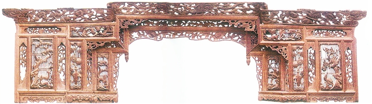 海南古代的石雕工艺传承有序,史料和实物较多。其工艺源于雕刻构建房屋的石柱、石砖和生活用品石磨、石缸,墓前的石人、石狮、石鸟逐步发展而来。解放后石雕工艺得到了长足发展,创作了不少精品。相比之下,有史料明确记载由海南本地木雕匠人雕刻的作品并不多见。琼山地区龙塘镇富礼村民吴坤桃(1892~1924)于民国十年曾雕刻过一幅插屏(长73厘、宽44厘米)。采用园雕、透雕、高浮雕技术,刻画出古代“单儒城”下将士作战场面,还刻有山水花鸟、飞禽走兽等图案。慰为壮观,堪称精细之作。因这幅插屏背面书写有记文,这才让我们得知这幅插屏的作者、作品的年代等内容。海南的宗祠文庙还保留着一些木雕作品,但清前期建筑难能一见,木雕作品也较为粗糙。