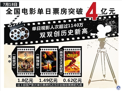 据初步统计,超过4亿元的票房中,《捉妖记》贡献了1.8亿元,上映3天累计票房已达4.85亿元;《煎饼侠》贡献了1.49亿元,上映两天累计票房达2.87亿元;《西游记之大圣归来》自7月10日上映以来,依靠良好口碑票房持续攀升,18日达6200万元,累计票房达4.05亿元,打破了国产动画电影的票房纪录。这3部国产影片单日票房约占18日全国总票房的九成。