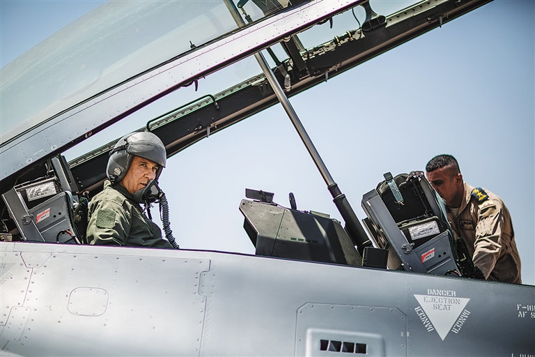 7月20日,在伊拉克北部的拜莱德空军基地,伊拉克国防部长奥比迪登上F-16战机。 当天,伊拉克总理阿巴迪、国防部长奥比迪及美国驻伊拉克大使斯图尔特·琼斯共同出席美国F-16战斗机交付仪式,美方正式交付伊拉克从美国采购的第一批4架F-16战斗机。