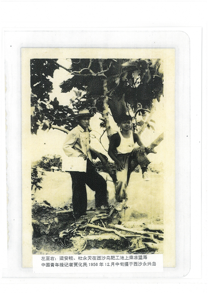 1955年10月,20岁的杜永天从海南财经学校毕业,被分配到海南鸟肥公司做会计。1956年1月,杜永天从琼海潭门出发,作为公司第一批工人前往西沙采挖鸟肥,支援农业生产。