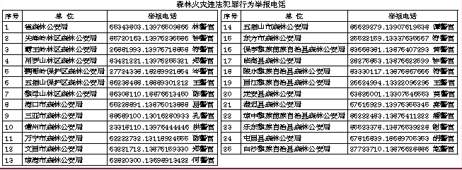 为进一步加大森林火灾案件查处力度,有效打击和遏制森林火灾人为纵火、失火等违法犯罪行为,省森林公安局决定向社会公布举报电话,并实行举报奖励,经查证属实的,可据其实际价值对举报人给予2000元至5000元奖励。现将各地森林公安机关举报电话公布如下: