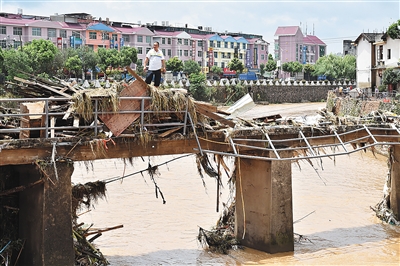 7月23日,洪水过后的福建省连城县一座步行桥上堆满垃圾。 7月22日凌晨起,福建省连城县普降大雨到暴雨,局部特大暴雨。据连城县委、县人民政府消息,截至22日21时,暴雨共造成4人死亡,5人失踪,全县17个乡镇不同程度受灾。 新华社记者 姜克红 摄