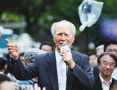 7月23日,在日本东京,日本前首相村山富市(中)发表演讲。 当日,91岁的日本前首相村山富市在众议院第二议员会馆前举行街头演讲,反对日本政府强行推进安保法案和日本首相安倍晋三的“暴走”政治。他演讲时还有数百人在该会馆前举行反对安保法案的抗议活动。 新华社记者 刘天 摄