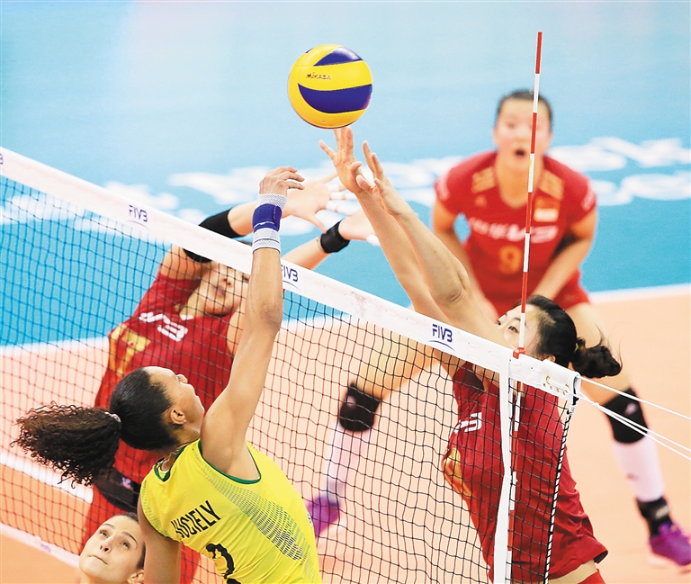 7月22日,2015年世界女排大奖赛总决赛在美国奥马哈展开。中国队在首场比赛中以1:3不敌巴西队。图为中国队球员颜妮(左一)和刘晏含(右一)在比赛中拦网。 新华社发