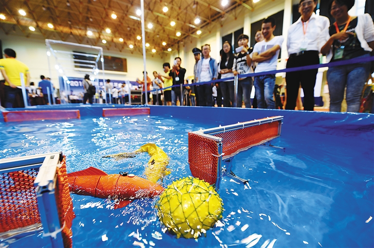 7月24日,智能仿生机器鱼参加水球比赛。 当日,为期两天的2015国际水中机器人大赛在兰州交通大学拉开帷幕,包括中国、挪威、韩国等国家和地区的近60所院校的代表队前来参赛。大赛以智能仿生机器鱼为主体,在水中进行各类竞赛,包括竞速、花样游泳、追逐和激烈对抗的水球比赛。
