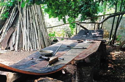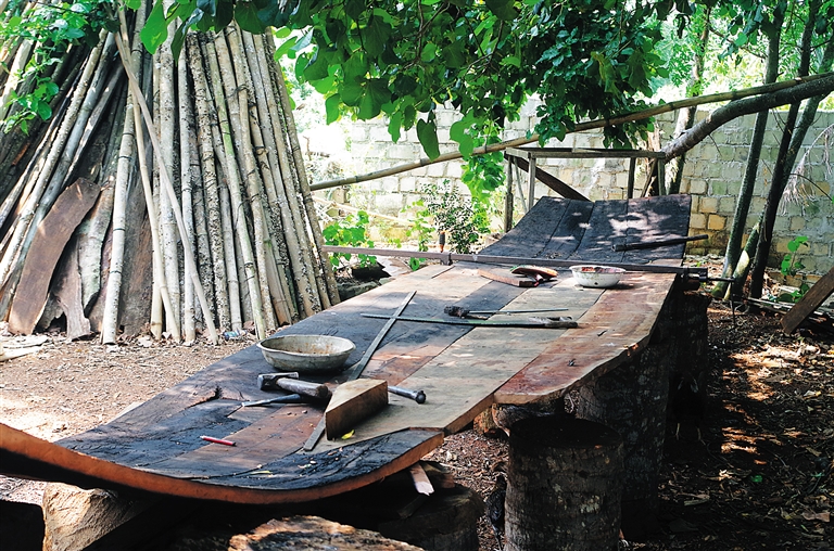 一把在木材上画记号的标尺有着几十年的历史,被它丈量过的木船不计其数;船木要用火烧,同时用水浇来弯曲它的形状;钉木材的钉子也比我们常见的钉子粗了好几倍;搁置船体的制作台仅仅是由几十块红砖搭建而成……