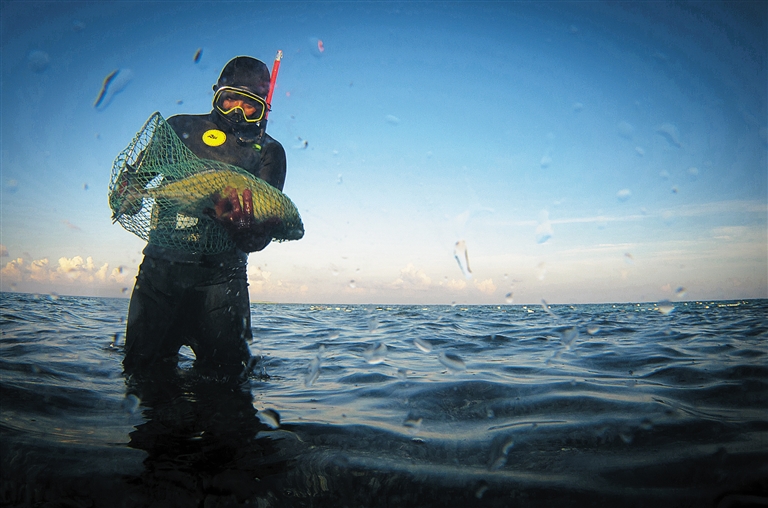返航途中,符名友告诉海南日报记者,这里渔民潜水作业多数是选择在晚上。因为到了夜晚,手持强光手电,潜水到20-30米水下捕捉渔获则是这里渔民的一个“绝活”。下氧人穿着潜水服下十多米深的珊瑚礁盘里,这时大海里的鱼都睡着了,用电筒照住它们的眼睛,这些鱼几乎在水下一动不动的,很容易捕捉。