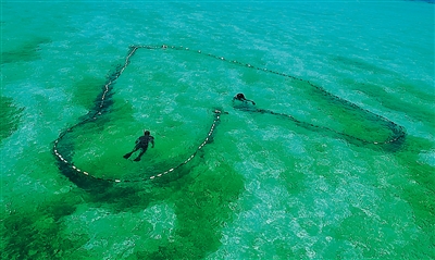 再次坐上了符氏兄弟的“琼三沙0002032”渔船,我们来到了赵述岛不远的海域。海面上漂浮着几个泡沫浮具,这是设置渔网的标志。“根据经验,我们提前在这里将渔网围成了一个长方形,并且在一边敞开着一个一米多宽的口,鱼顺着这个口游进网里后,就很难再出来了。”符名友说。这种围网捕捞的方式比较适合浅水区,如果对水流的判断准确的话,也会有很多意想不到的收获。而且,鱼游进网里后,人只要游进网内慢慢用网袋捞就可以了,这种方式远比深水捕捞要轻松的多。