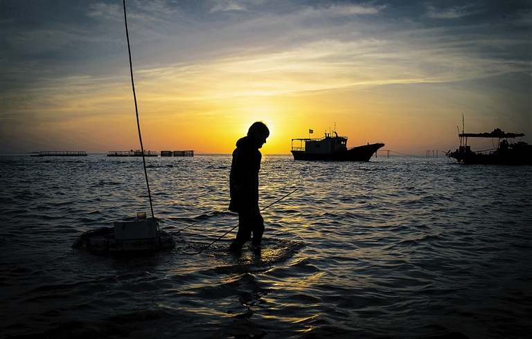 夕阳下,赵述岛外的礁盘上的海面上,一个人行走在没过膝盖的水里,身旁有两个漂浮在海上的筐子,人一走,筐子也跟着人的方向在“走”。走到岸边才发现,原来是一根绳子将筐子连接在人的腰部位置。