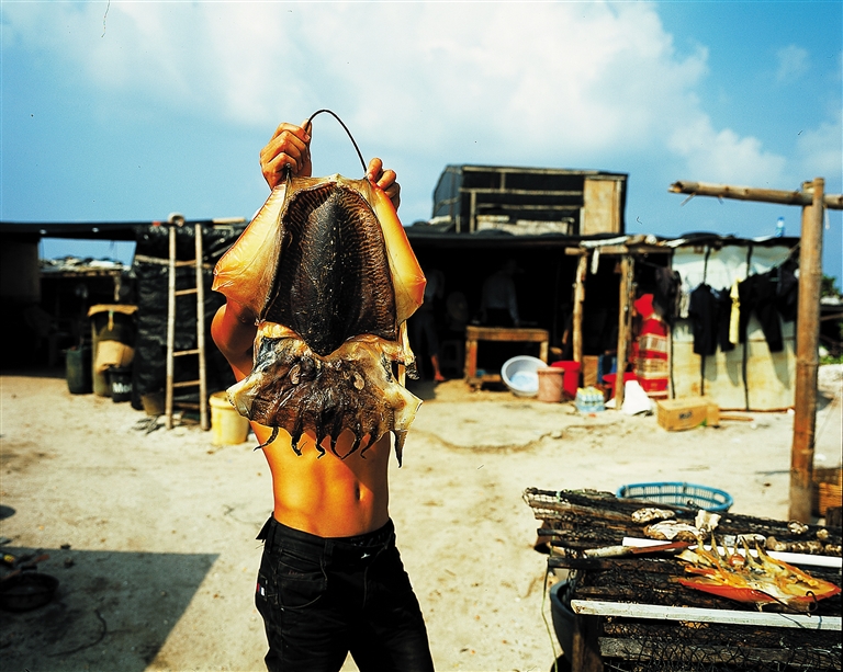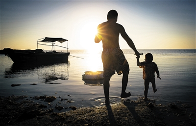 说话间,符名岗又浮出水面,一条刺鲍鱼(又名气鼓鱼)出现在他的网袋中。左手接过有鱼的网袋,符明友右手又顺势递给弟弟一个空网袋,这一递一送整个过程中没有一句话交流,也没有多余的手势动作。“在水下,都戴着呼吸管,无法用语言交流,只能靠手势。”符名友说,17岁开始,我们两兄弟就一直结伴出海去南沙西沙捕鱼了,这么多年来,下海捕鱼都是俩兄弟一起配合,从未分开过,多年的配合彼此之间已经非常默契。