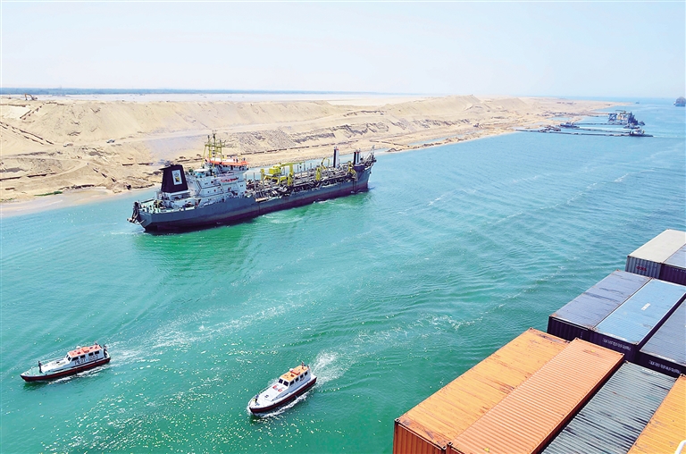 7月25日,在埃及伊斯梅利亚,船只在新苏伊士运河上航行。长达72公里的埃及新苏伊士运河当日完成试航,将于8月6日正式开通。