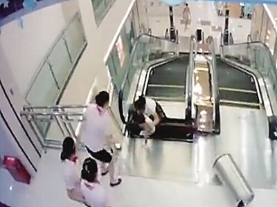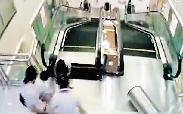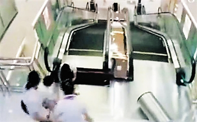记者获得的现场监控视频显示,向女士带着儿子乘自动电梯上楼,来到最顶层时,电梯与楼面之间的踏板忽然出现松动、裂开,向女士被卷入裂缝之中。危急时刻,她奋力将儿子托举出,孩子并未受伤。