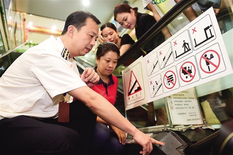 黄文和介绍,在扶梯的出入口端,都有一个红色的紧急制动按钮,在紧急情况下可以让电梯停下来。如果出现电梯上有人摔倒,或卷入,旁边的人可以采取制动。但是由于按钮是开放式的,任何人都可以触及,在电梯正常运转尤其是人员多的时候,请大家不要去按那个按钮,否则电梯急停很容易造成摔倒,严重时可能导致踩踏。