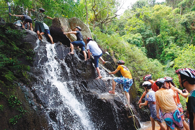 近日,记者在呀诺达景区梦幻谷看到,不少排着队参加踏瀑戏水的游客,他们在原生态的雨林丛林中挑战不同难度的戏水关卡,无论是大人还是孩子,都装备齐全,兴致盎然地比拼闯关,不时听见嬉戏打闹的欢笑声。