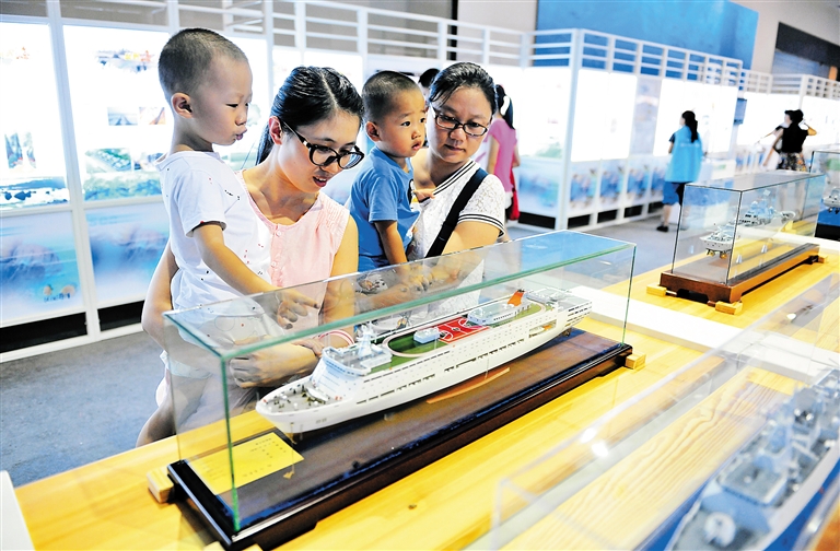 7月28日,省博物馆举办的“我爱这蓝色的国土”国防教育暨海洋知识科普展上,两位母亲带着孩子了解各种船舶的知识。