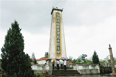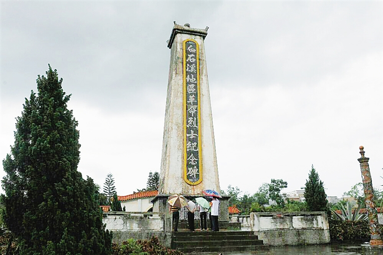 日前,冒着大雨,陈明炯在记者和东昌农场工作人员的陪同下,来到“白石溪地区革命烈士纪念碑”前,伸手抚摸那已红漆斑驳的碑文,上面镌刻着的烈士名单中,有他父亲的名字“陈文才”。