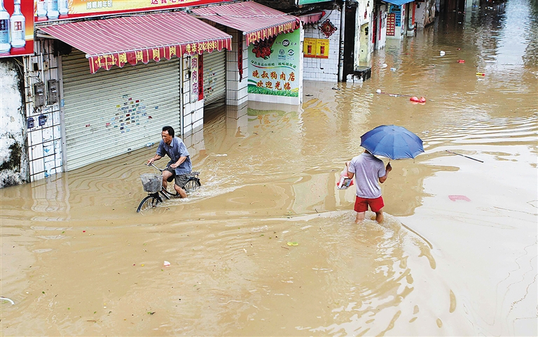 7月29日,广西钦州市中山路积水严重,人们涉水出行。