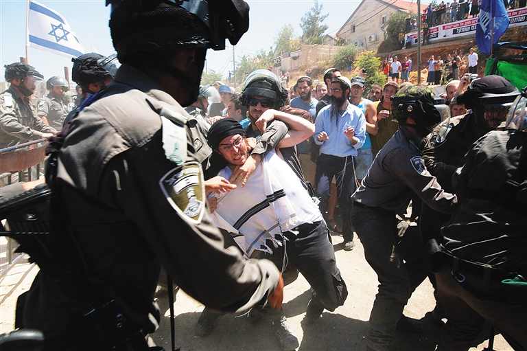 7月29日,在约旦河西岸城市拉姆安拉北部,以色列定居点居民与以色列安全部队发生冲突((上图)。以色列高级法院日前判决拆除在约旦河西岸定居点的两处非法建筑,拆除工作造成定居点居民与安全部队冲突。 新华社/法新