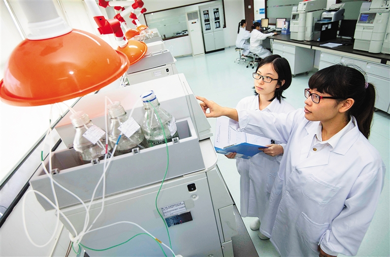 7月29日,位于海口药谷园区的齐鲁制药(海南)有限公司,质检人员正在对新药进行检测。近年来,公司研发投入均占销售收入的5%左右。目前该公司在研产品36个,申报产品26个。