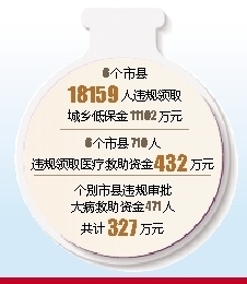 但审计也发现一些违纪违规问题:6个市县18159人违规领取城乡低保金11102万元,其中不符合规定人员领取城乡低保金5802万元,涉嫌骗取城乡低保金140万元,用于支付整镇整村搬迁补偿支出5159万元。此外,审计还发现6个市县710人违规领取医疗救助资金432万元,个别市县违规审批大病救助资金471人共计327万元,以及涉嫌伪造村委会公章骗取医疗救助资金。