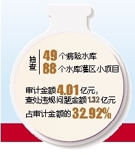 省审计厅对6个市县水利工程资金支出及病险水库除险加固工程资金进行审计,抽查了49个病险水库和88个水库灌区小项目,审计金额4.01亿元,查处违规问题金额1.32亿元,占审计金额的32.92%。其中就包括了病险水库除险加固工程管理混乱、工程建设监管不力等一系列问题。