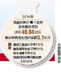 2014年,我省共审计了48个政府投资建设项目,涉及48.84亿元,查出各类违法违纪金额5.1亿元,其中:虚报工程造价5464万元,套取挪用资金2100万元,损失浪费139万元,违规招投标等问题金额4.32亿元。移送案件线索5件,涉案金额433.91万元。