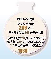审计发现,截至2014年底,救灾资金分配拨付较慢,资金闲置2.86亿元,已分配的资金4.96亿元未使用,占已分配资金21%;救灾补助款456万元发放不及时,救灾物资324万元违规折现发放;7个单位挤占挪用救灾资金1030万元,用于经费支出和办公楼维修等。