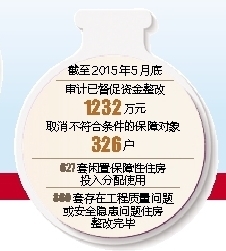 审计查出,有203户保障对象隐瞒、虚报家庭收入、住房等资料,骗取住房保障待遇;80户保障对象违规重复享受住房保障待遇;违规扩大范围审批284户家庭享受保障房;111户住房困难家庭应保未保。2305套已建成保障房空置未用超过一年;9867套棚户区改造项目已竣工尚未办理产权登记;2个市部分保障房项目延迟交付使用或出租不及时,造成损失浪费2313万元;17909套保障房由于选址偏僻等原因,导致保障性住房配租、配售不畅。