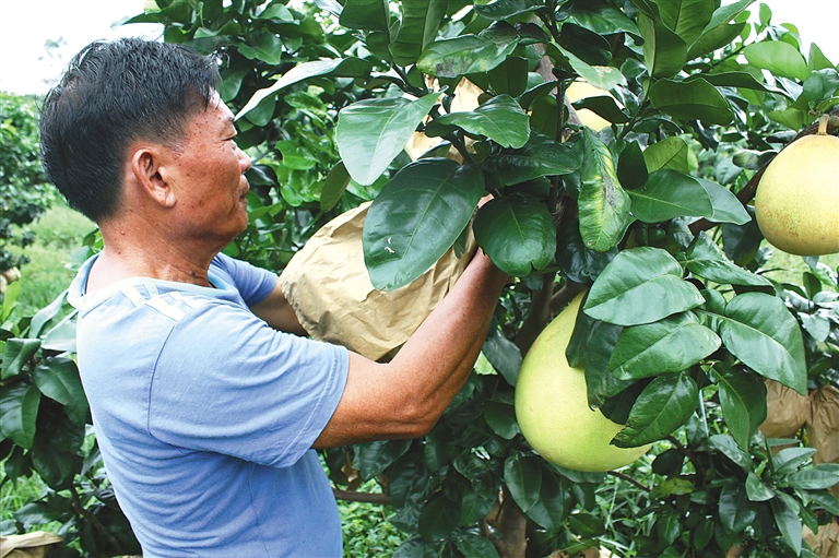 在位于南丰镇松门村的儋州元利柚果园,我们发现每棵树上都硕果累累,树枝被压得垂向地面,蜜柚都被套袋套着。