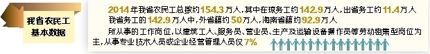 统计数据显示,2014年我省农民工总数约154.3万人,其中在琼务工约142.9万人,出省务工约11.4万人。在我省务工的142.9万人中,外省籍约50万人,海南省籍约92.9万人。从这些农民工所从事的工作岗位看,以建筑工人、服务员、营业员、生产及运输设备操作员等劳动密集型岗位为主,从事专业技术人员或企业经营管理人员仅7%。