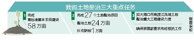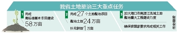 今年我省土地整治共有三大重点任务:一是完成高标准基本农田建设58万亩,此项工作已列为今年省重点项目;二是完成27个土地整治项目、整治土地24万亩,补充耕地1万亩;三是加大海口市南渡江流域土地整治重大工程建设力度,确保按国家要求完成相关工作。