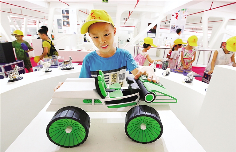在海南国际创意港,一名参加暑期夏令营的孩子被科技展品所吸引。本报记者 张茂 摄