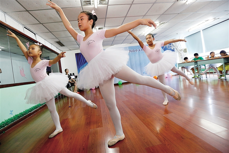 在海口市国贸路海南小天鹅少儿芭蕾舞团的暑期培训课堂里,小朋友们在排练表演芭蕾舞。本报记者 陈元才 摄