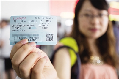 7月31日,一名旅客在南京火车站售票厅展示新版磁介质车票。 自2015年8月1日开始,新版火车票将在全国范围内替代旧版火车票发售。 新华社发(苏阳 摄)